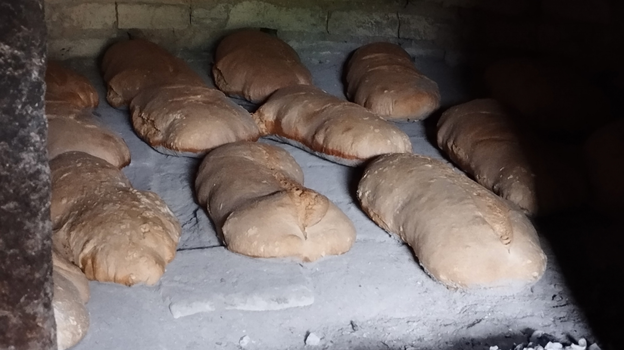El pan se elabora con harinas de trigo y centeno de cultivo biológico, molidas en molino de piedra. El salvado se extrae parcialmente. Amasamos con "lévedo" (masa madre), sal, y agua de manantial. Está cocido en horno de leña tradicional. En el horno de gas hacemos en molde un magnífico pan de centeno con semillas, también bio(receta de Iban Yarza).