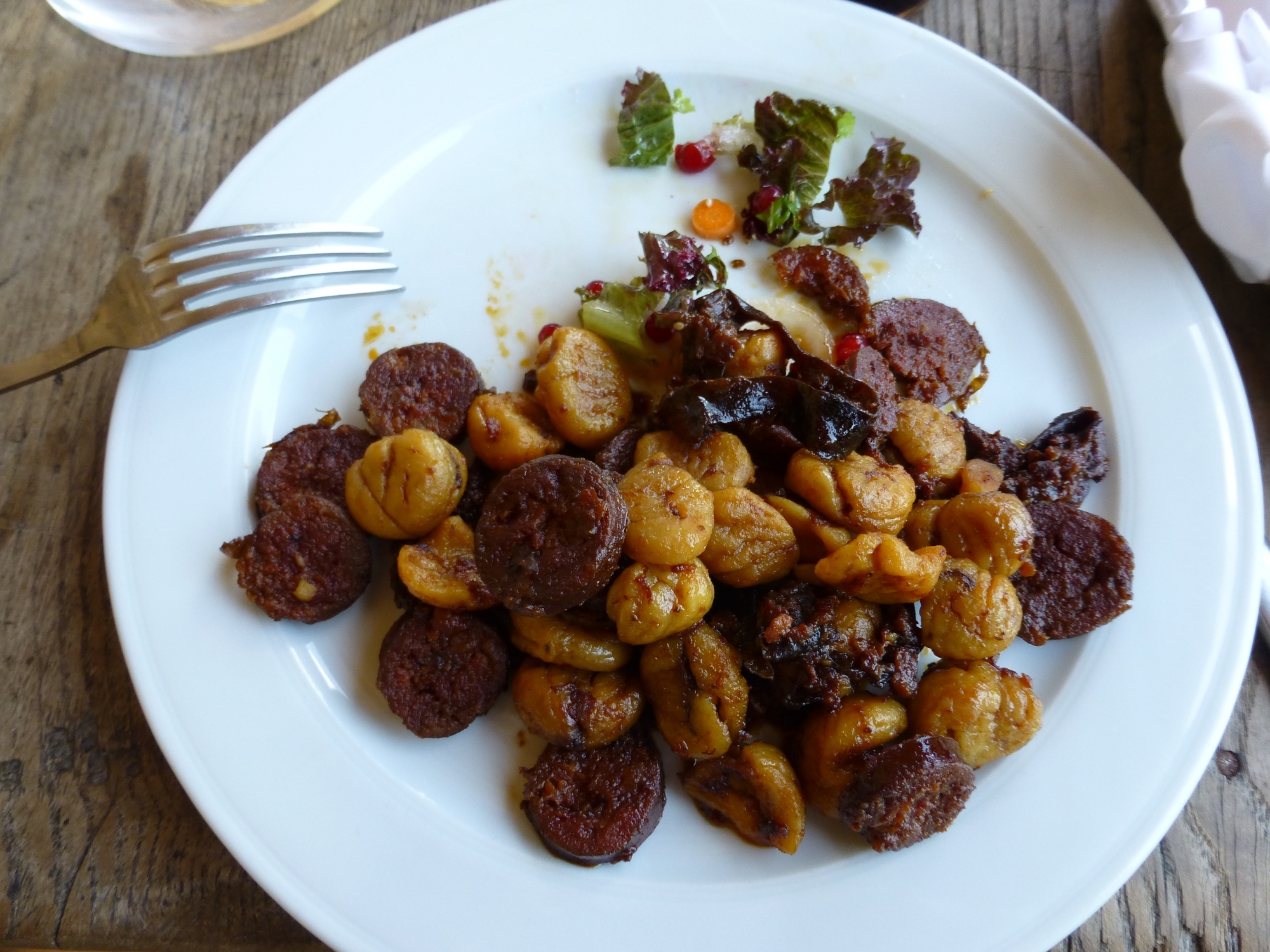 La castaña no podía faltar en nuestros platos, salados y dulces. Un alimento imprescindible en estas tierras, el castaño es aquí también paisaje, casa, moneda…Durante siglos se conservó seca, llenando las arcas del hogar, con el fuego en los sequeiros, construcciones que hoy son ruinas; luego vendrá la pisa y el cribo, finalmente una minuciosa escolla para separar las destinadas a animales y a humanos. Así lo aprendimos e hicimos nosotros mismos durante años y se recreó en varias ediciones de la Festa da Pisa https://www.facebook.com/watch/?v=174258976852682