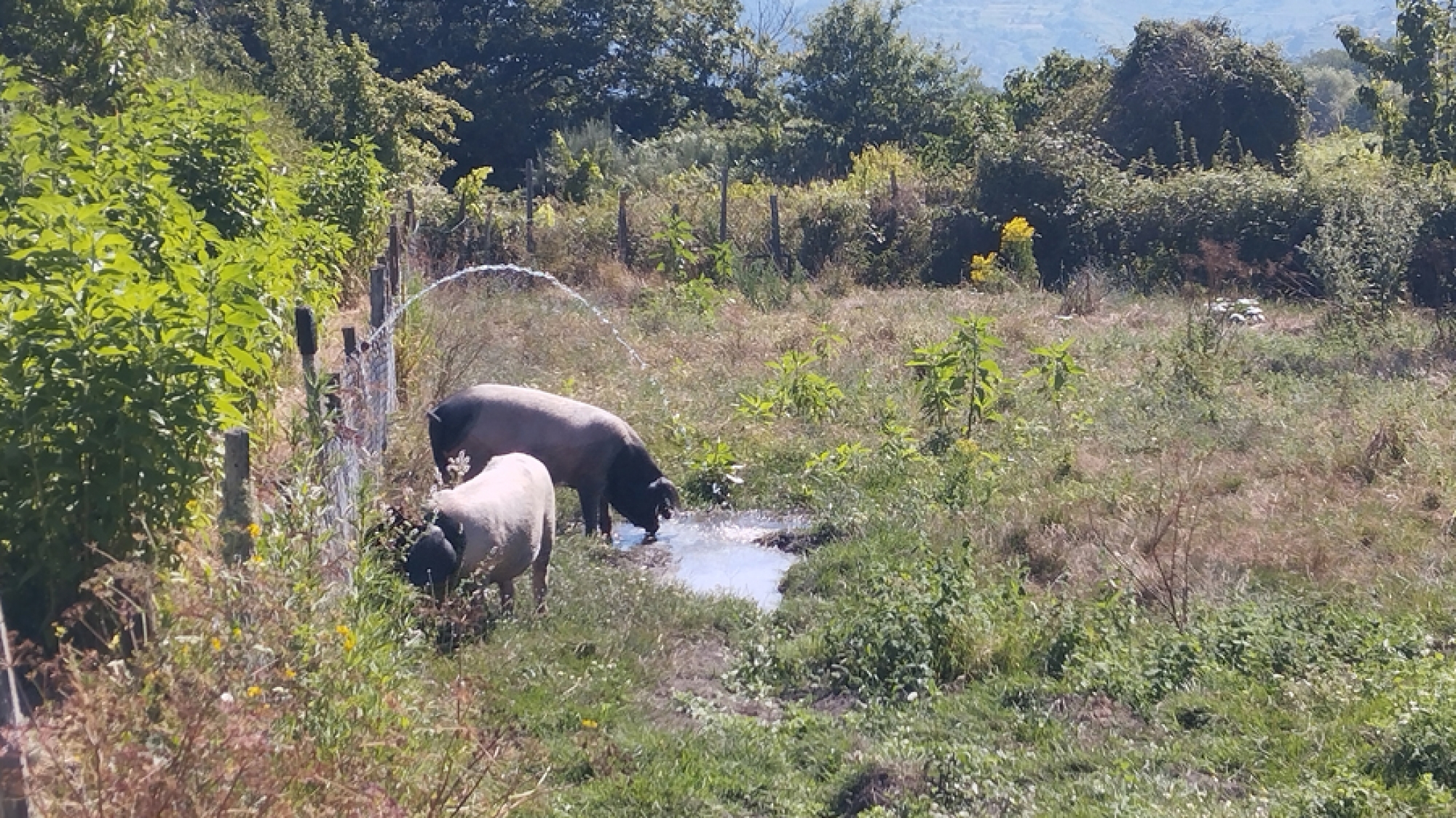 Nuestros embutidos , hechos aquí por nosotros, sin ningún aditivo, son de porco celta, una raza de calidad excepcional. Los criamos 7 u 8 meses en una parte de la huerta, al aire libre, compartidos con unos vecinos-